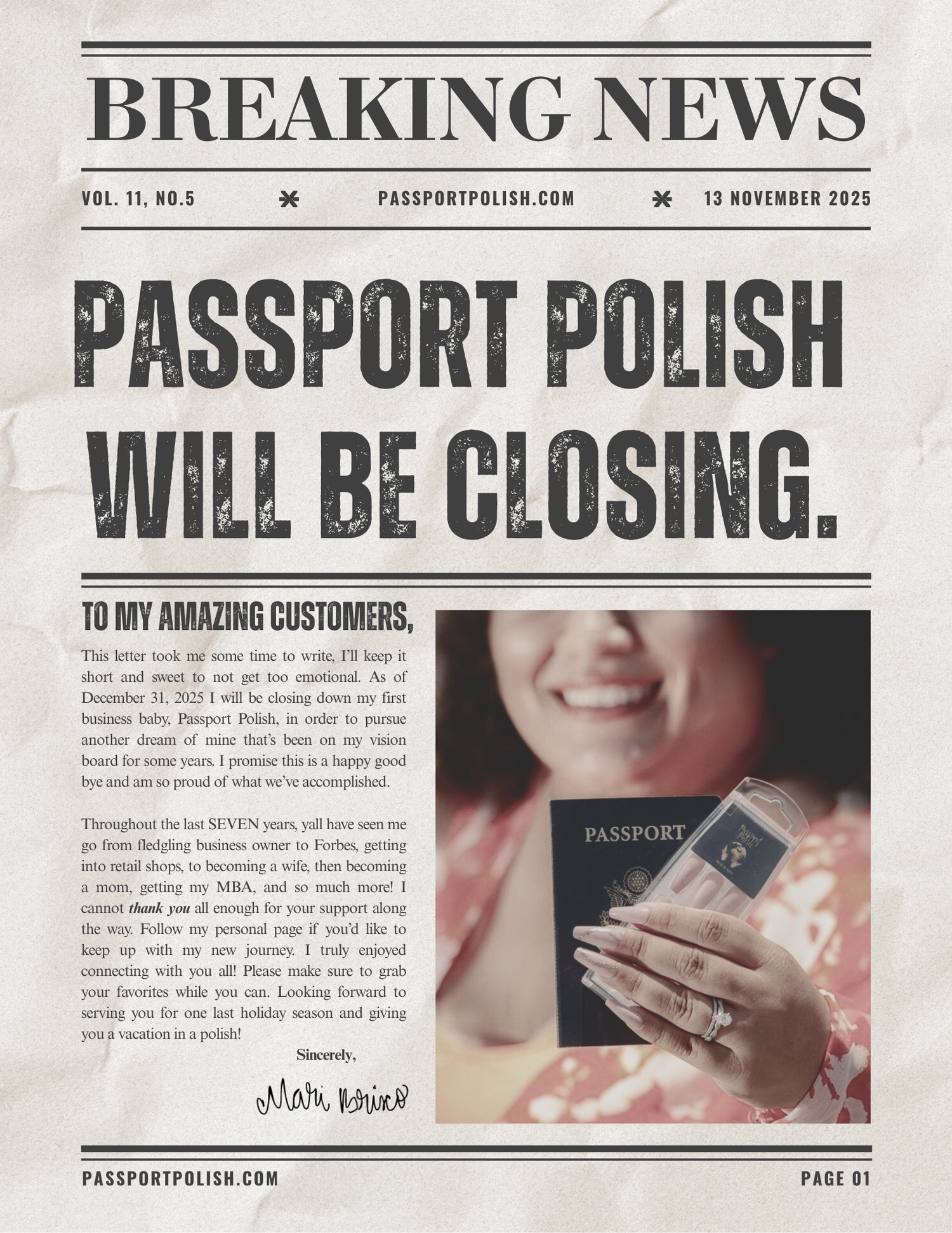 Launched in 2018, Passport Polish was created to give you a vacation in a polish. From the bazaars of Marrakesh to the cafes of Paris, your nails deserve a passport too. Each polish takes a different element from the country's culture, ranging from a flag color to the national flower. Our globally inspired shades are made for polish lovers who know style never takes a vacation and culture is meant to be celebrated on your fingertips.