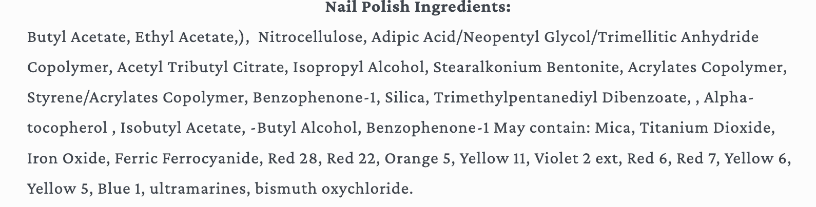 Ingredients: Butyl Acetate, Ethyl Acetate,), Nitrocellulose, Adipic Acid/Neopentyl Glycol/Trimellitic Anhydride Copolymer, Acetyl Tributyl Citrate, Isopropyl Alcohol, Stearalkonium Bentonite, Acrylates Copolymer, Styrene/Acrylates Copolymer, Benzophenone-1, Silica, Trimethylpentanediyl Dibenzoate, , Alpha-tocopherol , Isobutyl Acetate, -Butyl Alcohol, Benzophenone-1 May contain: Mica, Titanium Dioxide, Iron Oxide, Ferric Ferrocyanide, Red 28, Red 22, Orange 5, Yellow 11, Violet 2 ext, Red 6, Red 7, Yellow 6, Yellow 5, Blue 1, ultramarines, bismuth oxychloride.